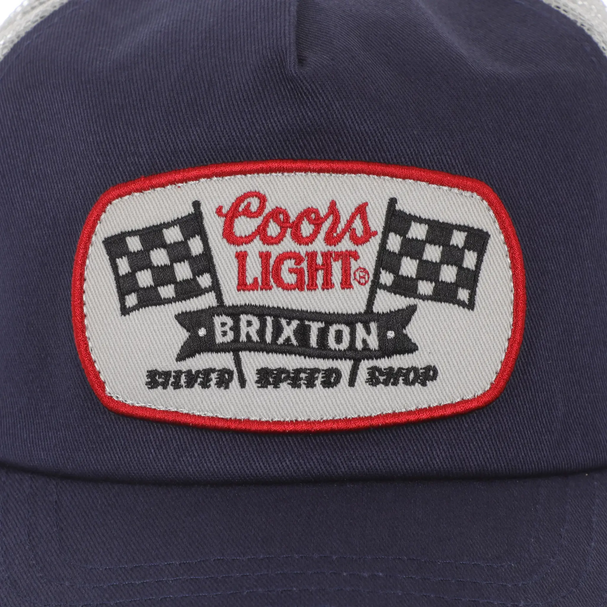The Brixton x Coors Light Pit Stop MP Trucker in Navy/Silver is a retro-inspired essential. This medium-profile cap features a breathable mesh back, a structured front with vintage Coors Light racing graphics, and an adjustable snapback for a custom fit.