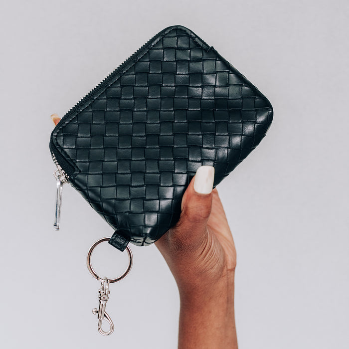 • This pouch wallet is great with its 6 card slots, double zips and hook and keychain ring.