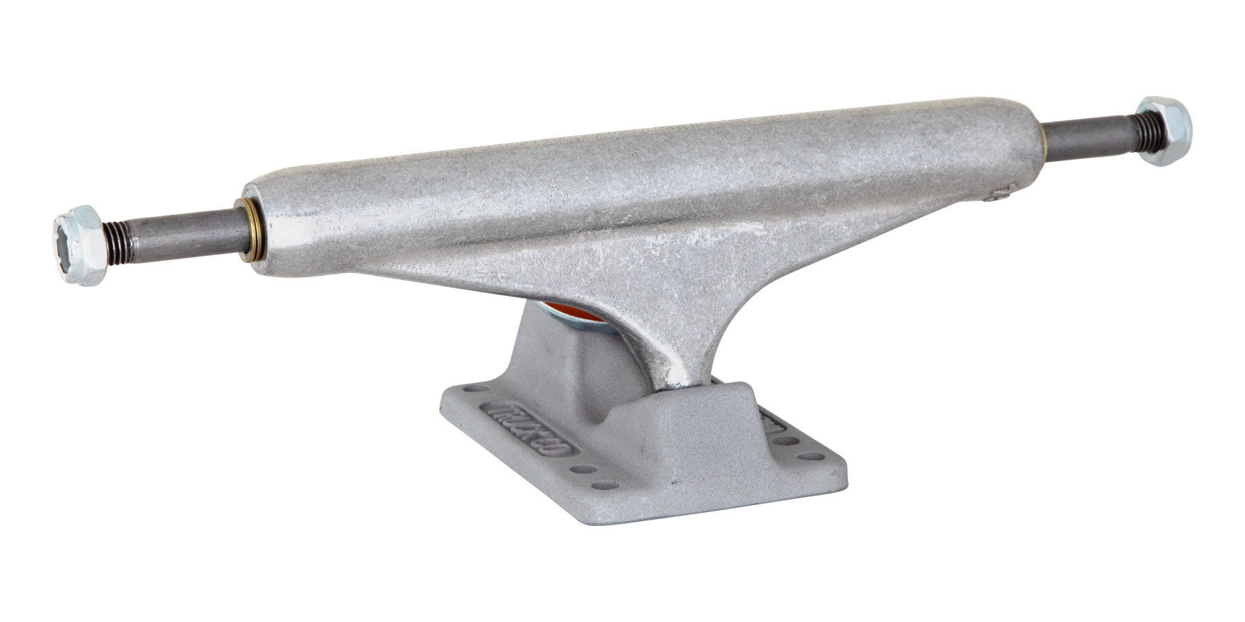 Durable, all purpose, standard height truck with newly improved inverted kingpin features polished silver hanger with raw base plate, orange cushions, and silver hardware!