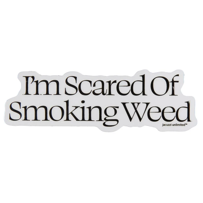 Show your fear of sativa using the Scared Weed sticker from Jacuzzi, offering a die-cut silhouette of the standard text phrase. Perfect for decorating your rear windshield or posting a reminder on your bong.