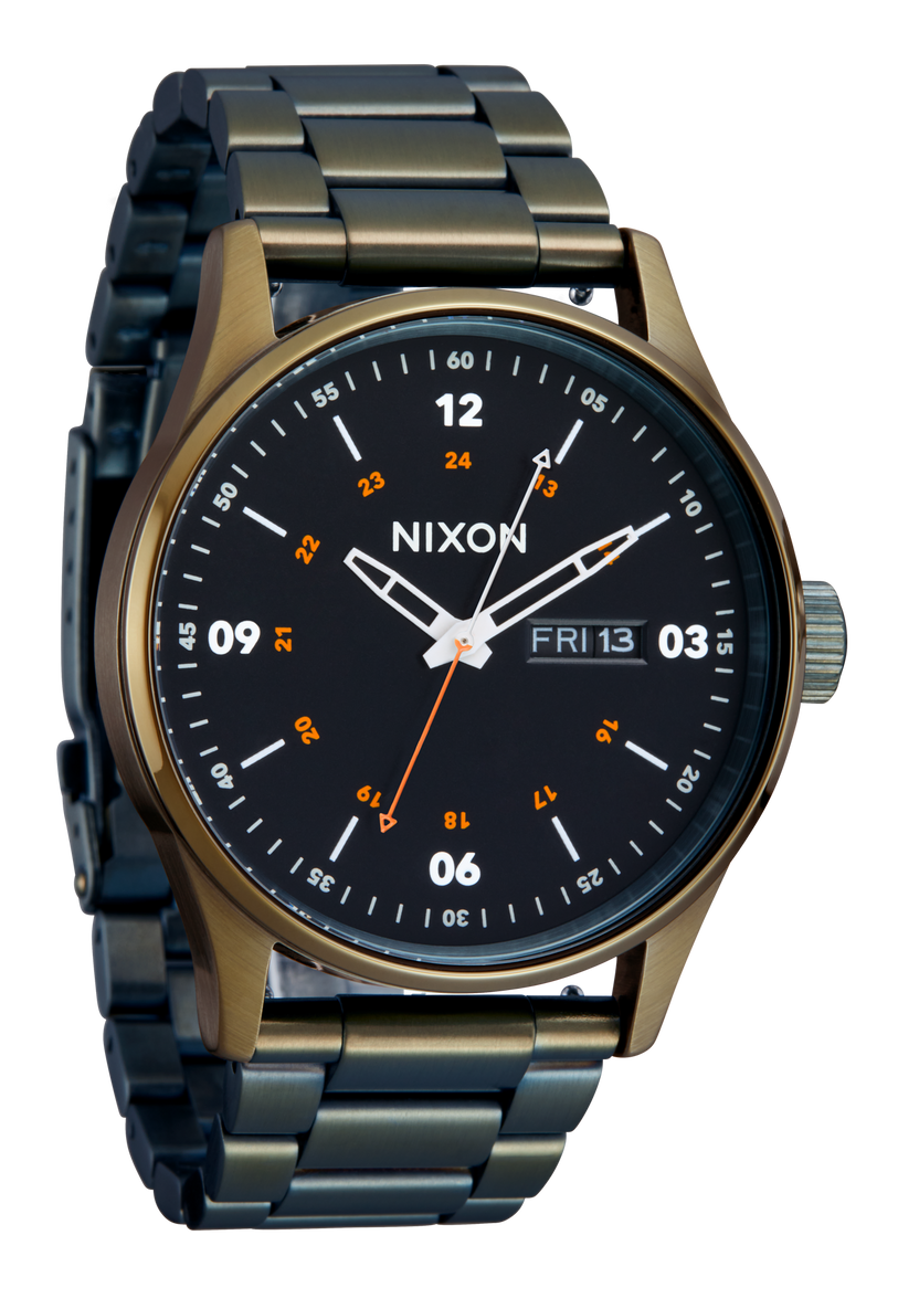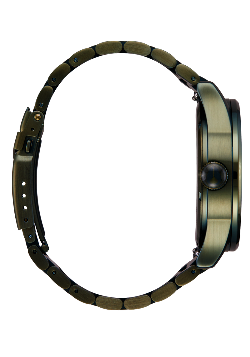 42mm custom solid stainless steel case with a 100 meter / 10 ATM water rating. Comes with a hardened mineral crystal, triple gasket crown with enamel fill, stainless steel screw down caseback and spring pin lugs.