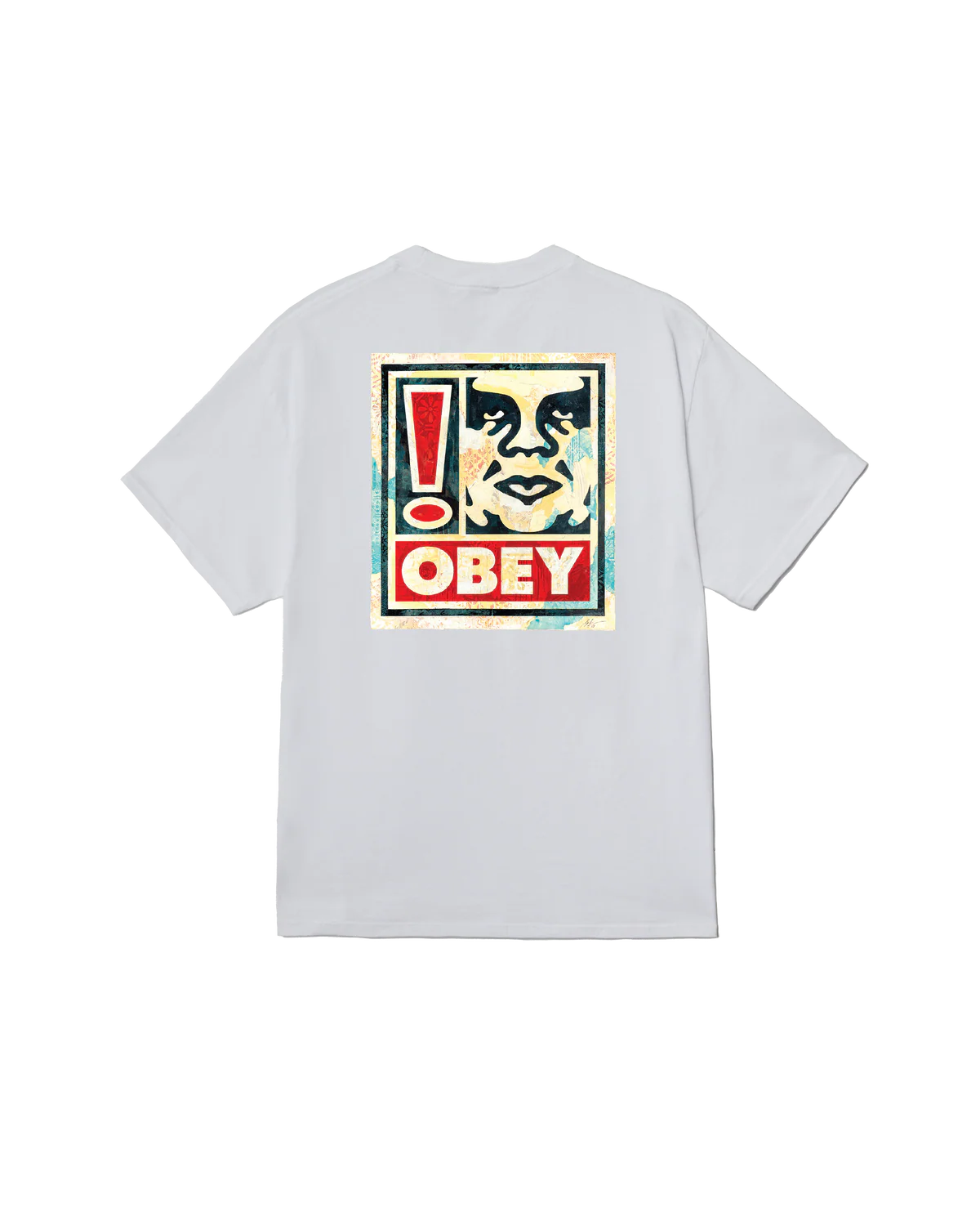 Classic tee with bold exclamation graphic printed on front and back. 100% cotton, 6oz regular fit — clean white streetwear staple rooted in Shepard Fairey's art and OBEY's design legacy.