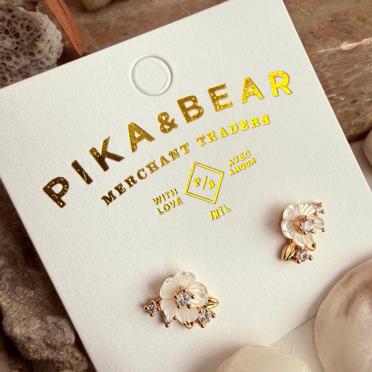 - Composed of 0.5 micron 18K gold or white gold plated brass + ecoat, mother of pearl, rhinestones.