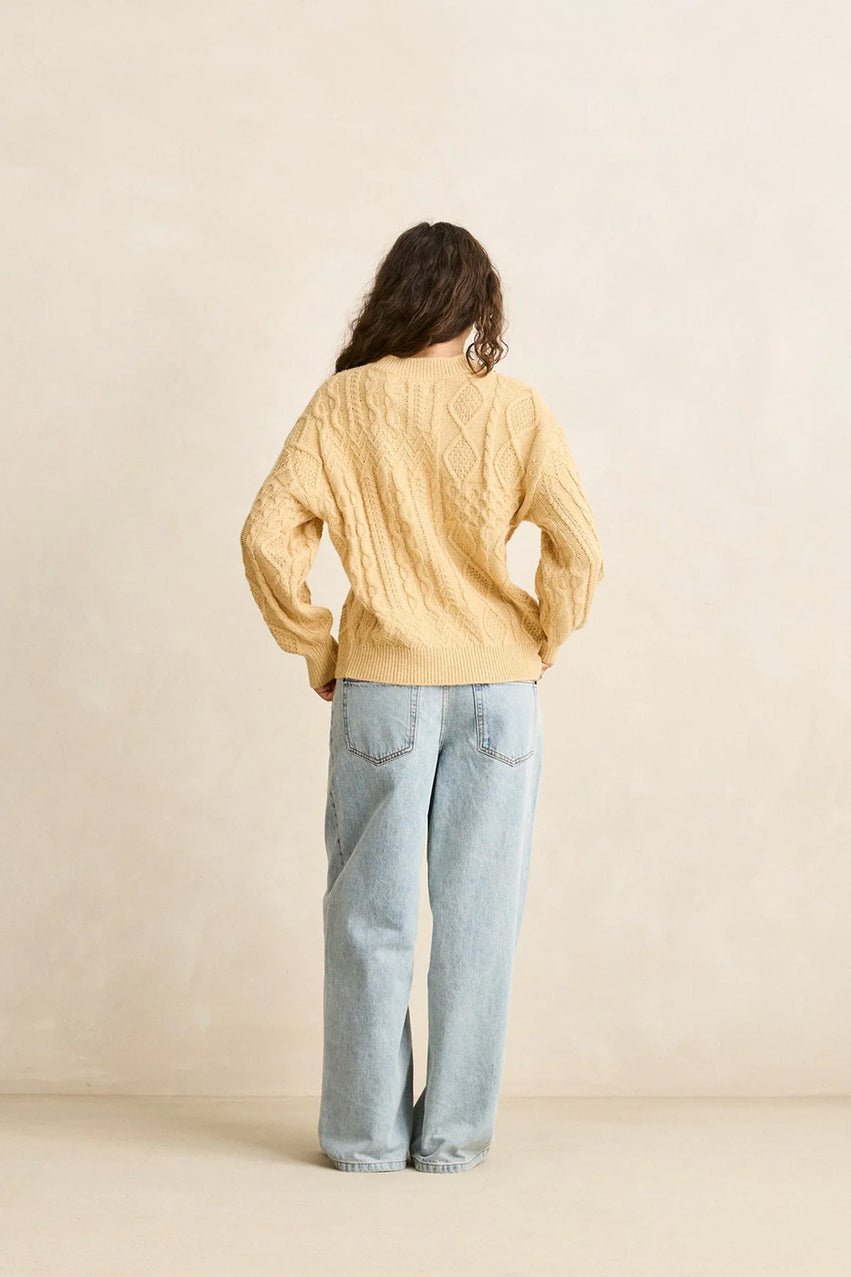The Patchwork Sweater is a textured crew neck knit with dropped shoulders and rib finishes at the neck, sleeves, and hem. A patchwork construction gives it a laid-back, handcrafted feel!