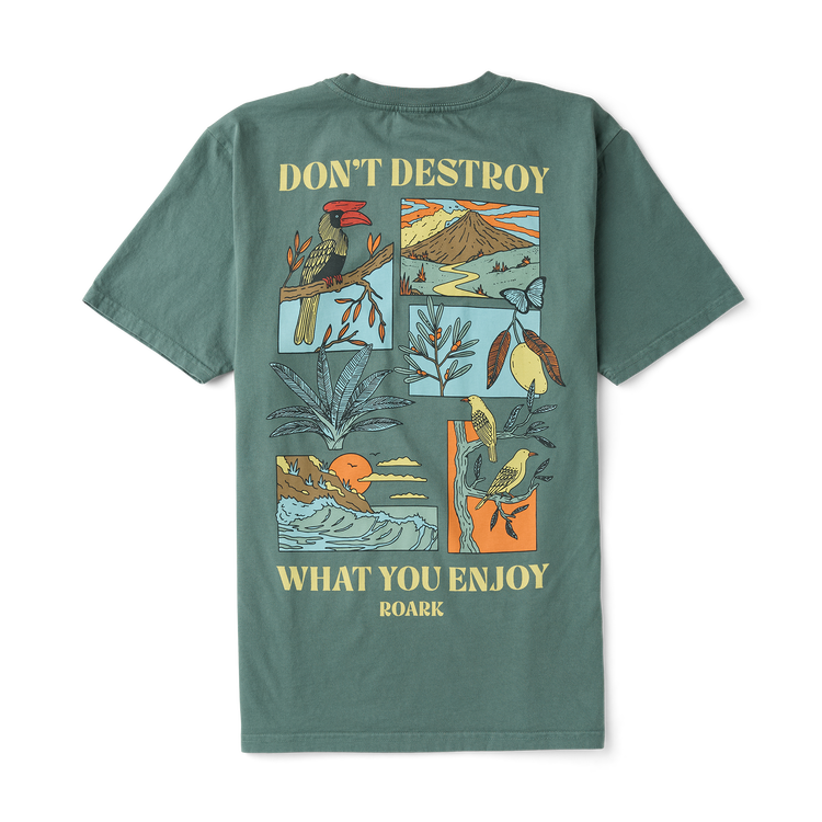 The Roark Enjoy Premium Tee in Slate Green features a soft-hand screen print on 100% organic cotton. Designed with a slim-straight fit, it offers breathable comfort and a timeless, adventurous look.