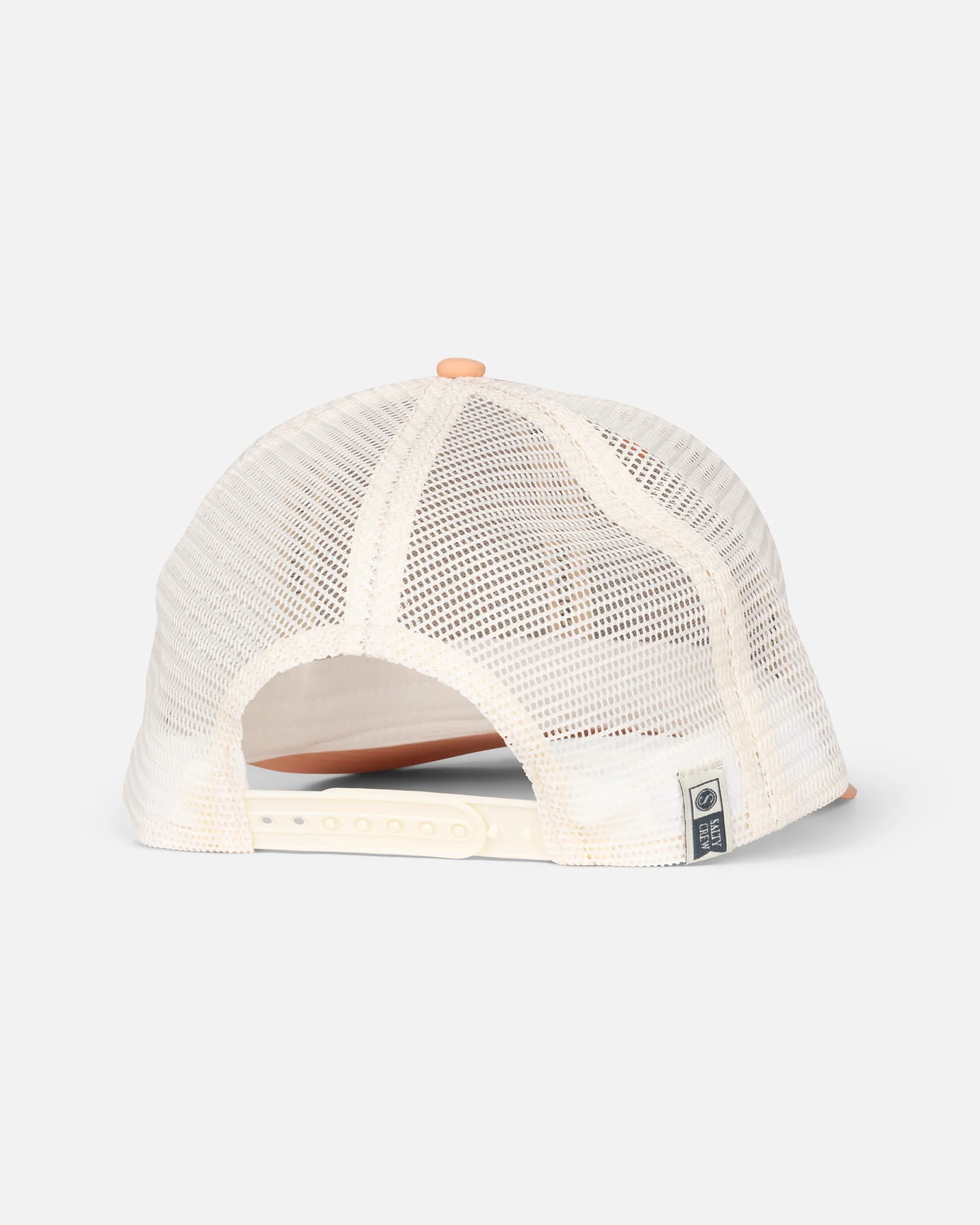 The Salty Crew Bruce Retro Trucker in Apricot features a 6-panel structured design with a breathable mesh back. Made with a mid-profile fit, it includes an adjustable snapback and a custom woven shark patch.