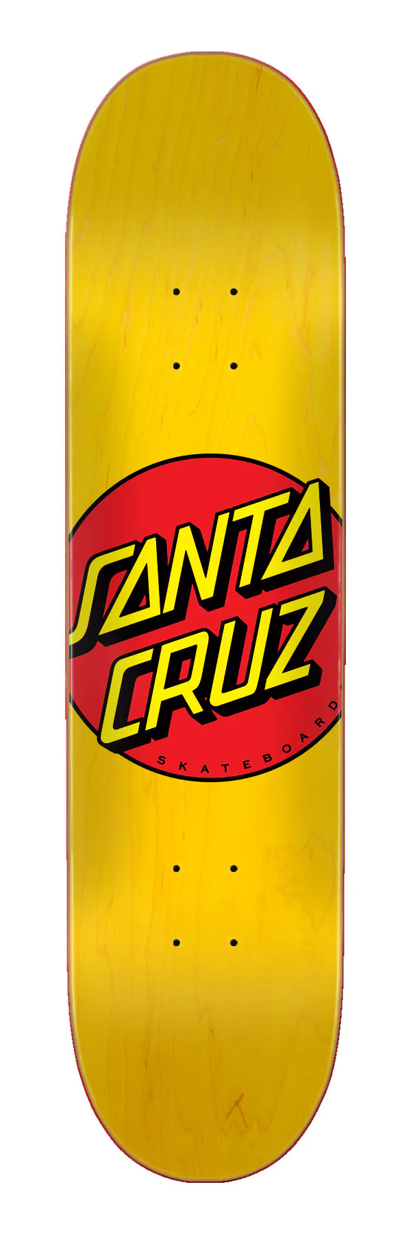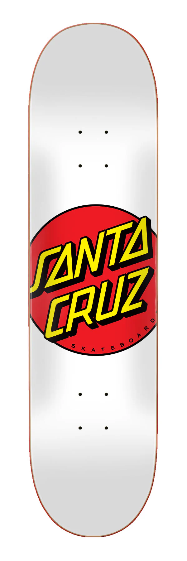 Santa Cruz Skateboards Classic Dot Series deck on new 3D concave. 3D concave features a medium depth concave with lower, continuous nose and tail kick, plus concave in the nose in tail that combine to create pockets to lock in your feet.