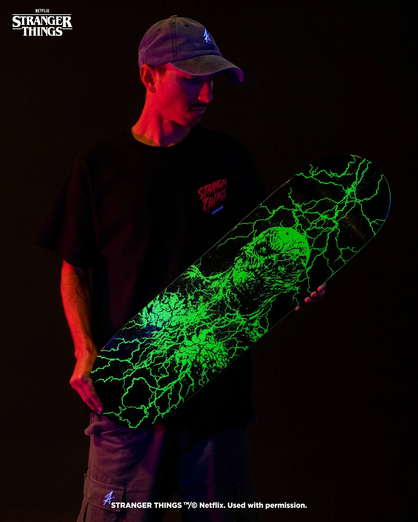 • The Santa Cruz x Stranger Things Vecna 8.5" deck features a glow-in-the-dark design on a fully dipped green board. Built with 7-ply North American Maple, it offers premium pop and stability for street or park sessions.