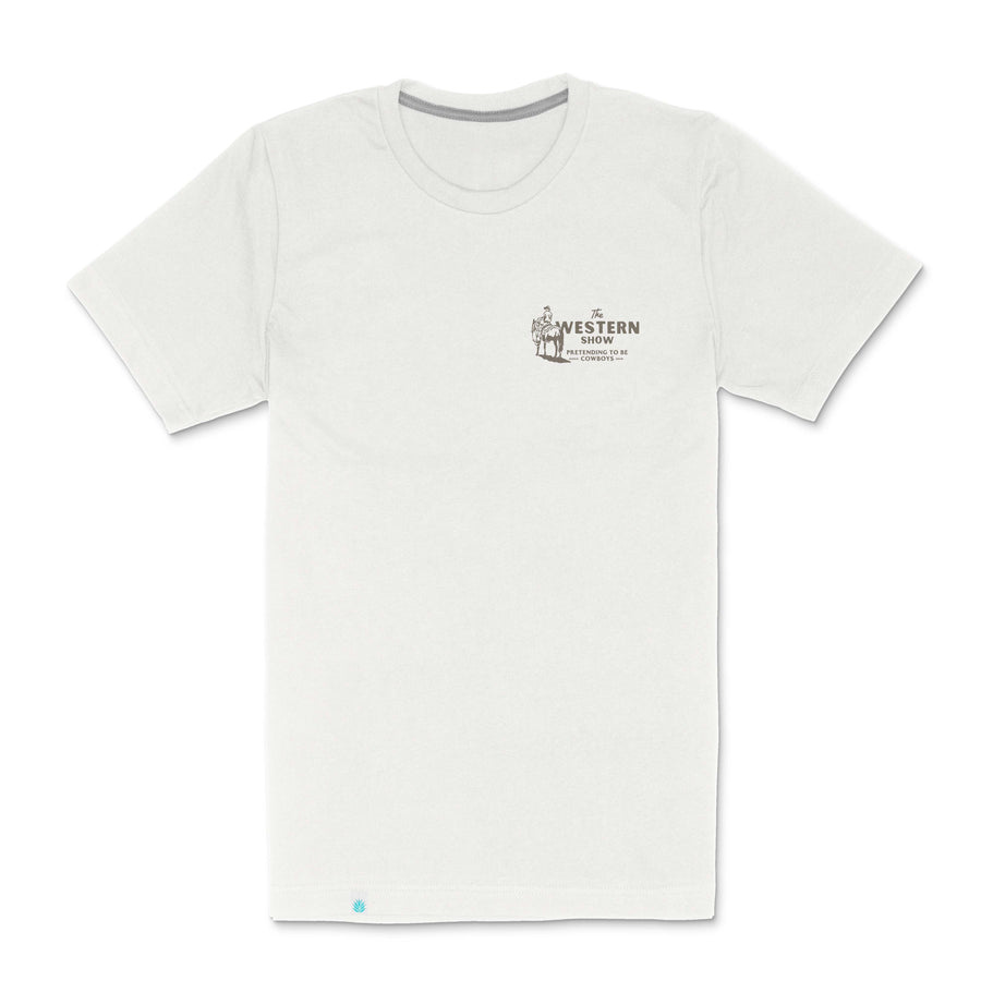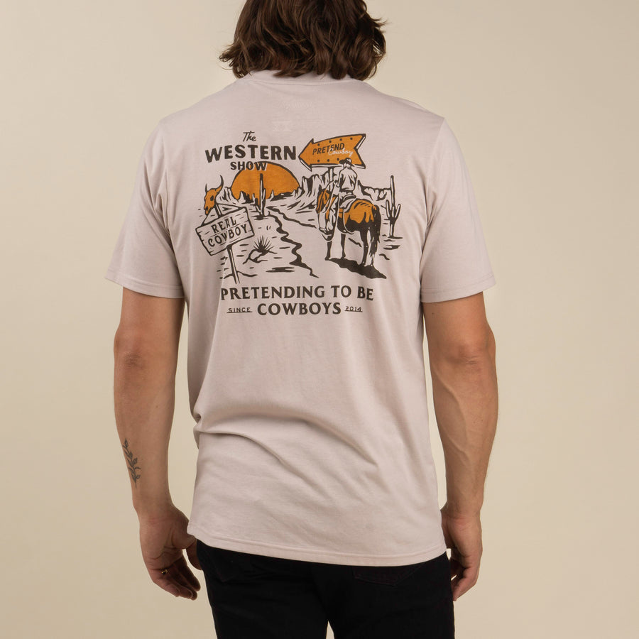 The road has been long and hard for this ol' cowboy, but he paces onward across the dusty plain. Carved by his own grit and determination, the path leads on...