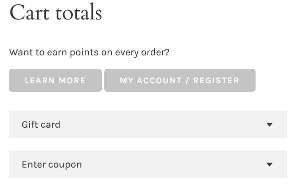 A: You’ll find it in your Cart, on the left side under ‘Cart Totals.’ Just click on ‘Rewards,’ and your 10% will be there!