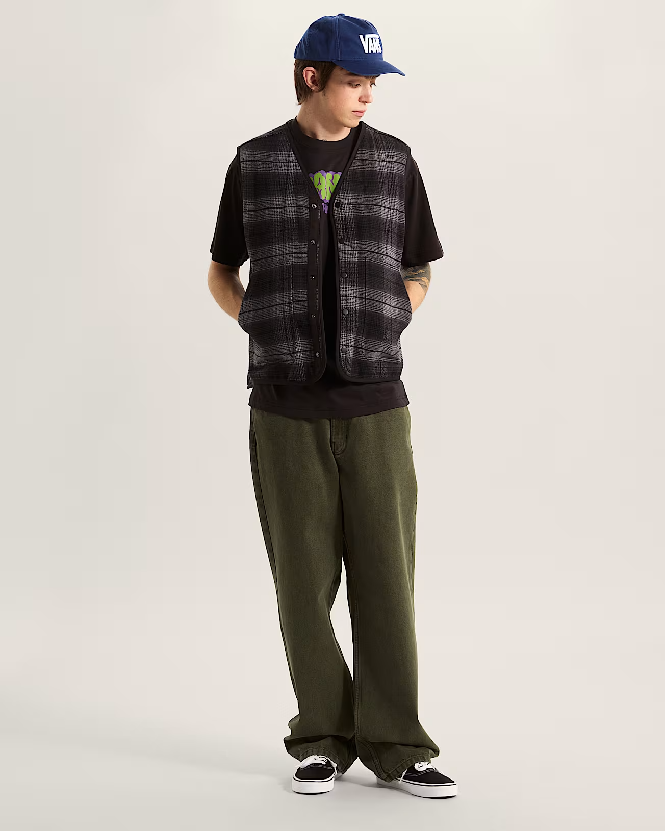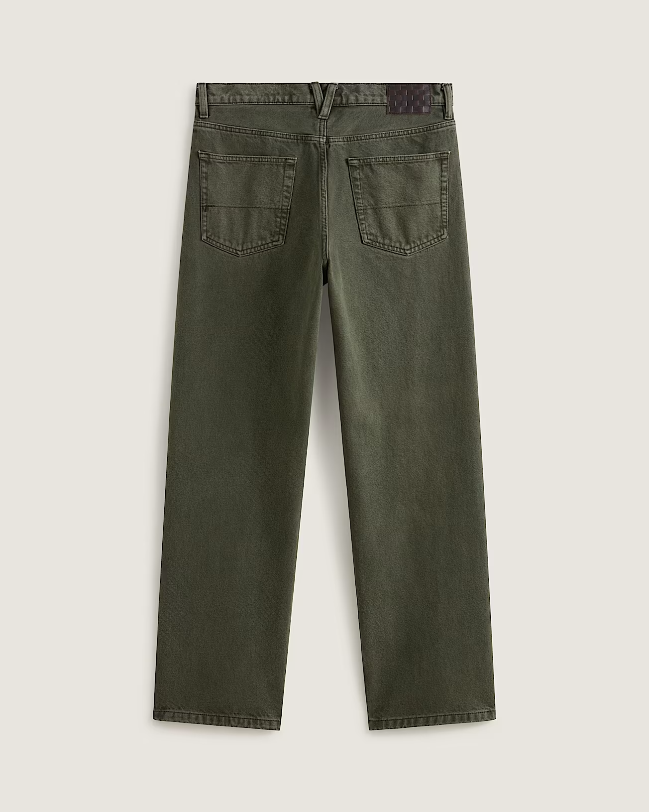 • The Vans Check-5 Loose Denim Pants in Mossy Olive offer a rugged 90s-inspired fit. Made with 13.25 oz cotton denim, they provide maximum durability and a relaxed silhouette for all-day skate sessions or casual wear.