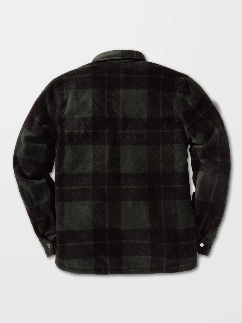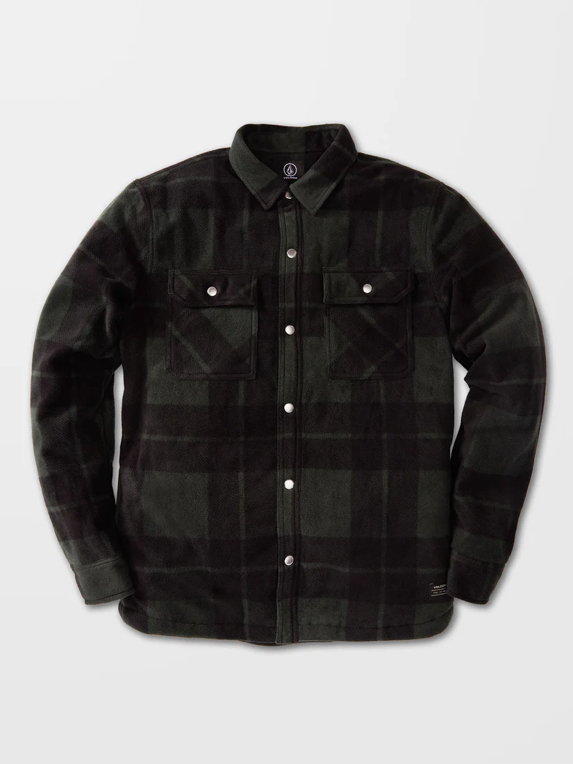 It includes snap-button closure, chest and side pockets, and subtle Volcom branding for functional style.