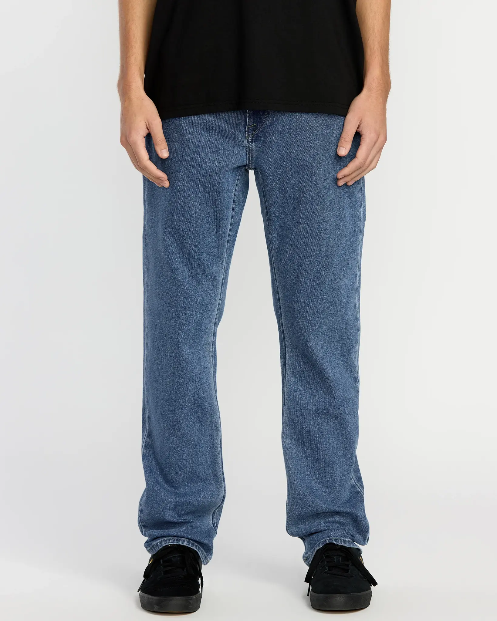 The Solver Denim serves a modern straight leg with a 16-inch opening that stacks clean over your kicks. Medium indigo with a light enzyme wash, finished with signature Volcom jeans details. Made using our Water Aware process to cut water use.